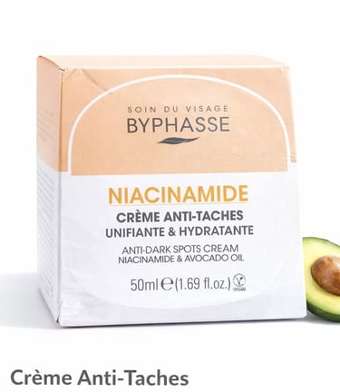 Crème anti-taches pour une peau unifiée et hydratée. Enrichie en niacinamide et huile d’avocat, elle aide à réduire les taches, uniformiser le teint et nourrir la peau en profondeur. Format pratique : 50 ml (1.69 fl.oz.).